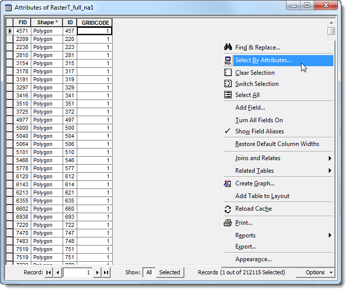 - Click Apply, in the attribute table all the rows with a GRIDCODE equal to two (2) are highlighted in a cyan color. If the shapefile is displayed in the ArcMap window, the same items are highlighted in cyan.