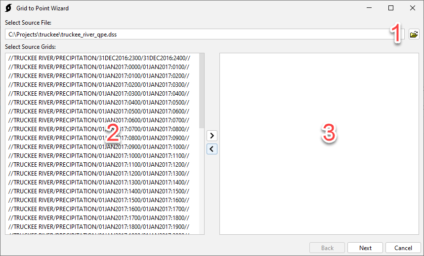 Select a Source Grid file using the File Browse button (1). When a source file is selected, its Variables will be displayed in the Available Variables column (2). Variables can be moved from the Available Variables column to the Selected Variables column (2 to 3) by double-clicking the variable or using the arrows to move the selected variable.