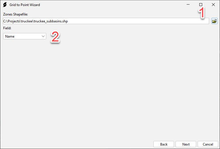 Select a Zones Shapefile using the File Browse button (1). When a zones shapefile is selected, its fields will display in the Field combo box (2). Select a field in the field combo box (2). The selected field will be the basis for the B-Part of the DSS time series records that are created. If you want a total watershed average time-series then you will need to create a shapefile where subbasins have been merged together (there should be only one polygon for the entire watershed). If you want average time-series for each subbasin, then the shapefile should contain a polygon with a unique name for each subbasin.