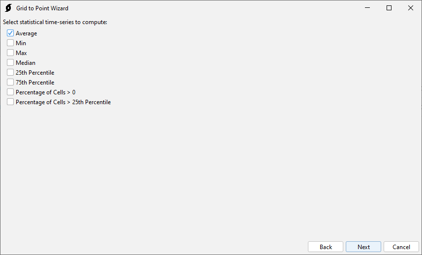 Select statistical time-series to compute by selecting the checkboxes. By default, the Average time-series is selected. The user can also select the following statistics:
