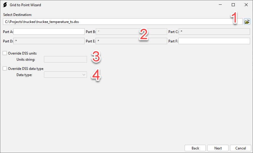 The File Browse button (1) can be used to browse to a Destination file. If the destination file is HEC-DSS format, additional options are presented for specifying pathname parts (2). Some pathname parts cannot be edited and will be populated automatically. There are also options for changing the DSS Units (3) and DSS Data Type (4).