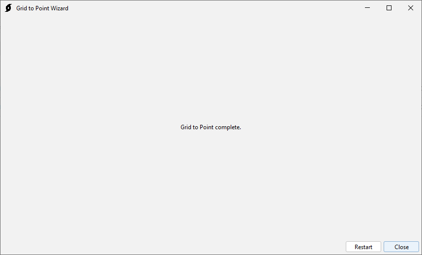 After the Grid-to-Point-Converter is complete, the wizard will automatically progress to step 6, indicating that the conversion is complete. There are buttons to Restart or Close the wizard. The time-series data will be saved to the user selected DSS file (chosen in step 4). The user will need to create a time-series gage object within the HEC-HMS project and link the object to one of the time-series records in the DSS file in order to use the time-series data within an HEC-HMS simulation.