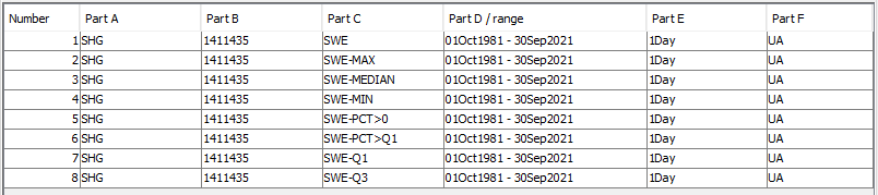 The computed time-series statistics can be viewed in HEC-DSSVue. The following table lists the naming convention for the various statistics.