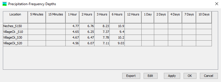 The Frequency Precipitation Calculator was added in v.4.10 and is used to quickly calculate average precipitation depths and apply new precipitation depths at either the watershed or subbasin level. These calculated values are displayed in the Precipitation-Frequency Depths Table Dialog. New features have been added to the Frequency Depths Table Dialog including an Edit and Export button. The Export button will allow the unedited precipitation depths to be exported to a CSV file. The user can enable editing to change precipitation depth values in the table with the Edit button. Editing values will disable the Export button.