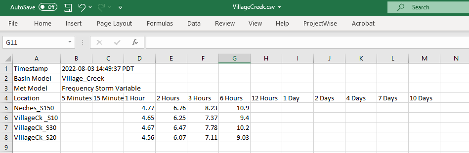 The generated CSV file will contain a header with pertinent model data and the Precipitation-Frequency Depths Table. Header data will include a timestamp of when the depths were exported, Basin Model name, and Meteorologic Model name.