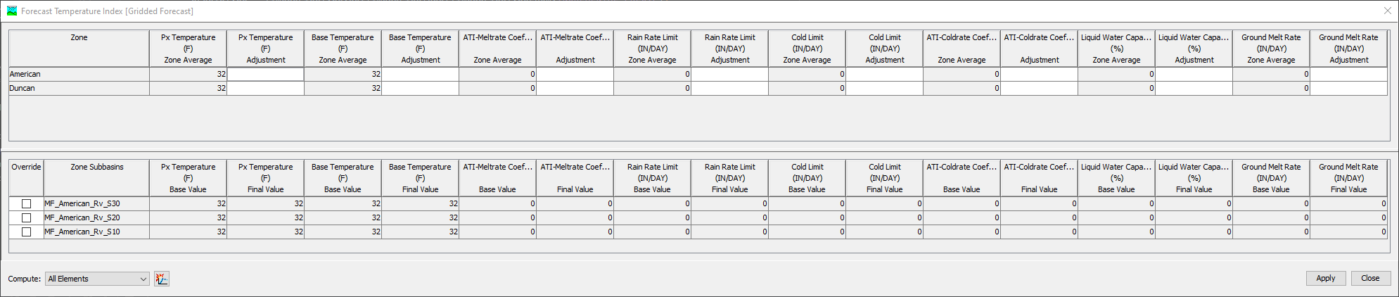 The new Temperature Index Zonal Editor allows for editing of Snow Method parameters that utilize Temperature Index or Gridded Temperature Index methods within a Forecast Alternative. Parameter adjustments can be made within defined zones (groups) of elements, or to individual elements within the zones.