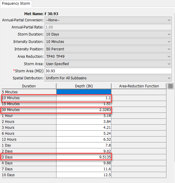 The Frequency Storm method now allows users to add 10 minute, 30 minute, and 3 day depths for creating a balanced hyetograph.