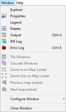 The Window menu contains a list of the windows in the user interface that can be displayed. In addition, actions to set the view on the current Map Window are provided.