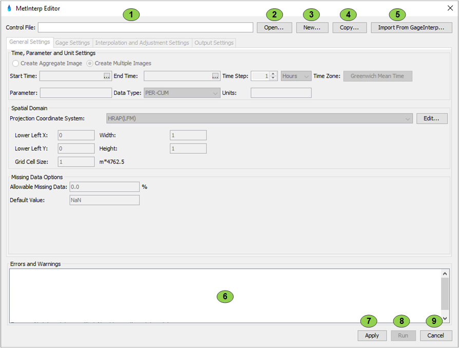 The MetInterp Editor is a tool for creating, editing and running MetInterp computations. This tool can be accessed through the button. When launching the editor for the first time, the editor will show up with most of the components disabled, but those will become enabled after a control file is selected. This can be done with the "Open..."button, "New..." button, directly typing the control file path into the text field. Components outside the tabbed section are described in the image below. Within the editor there is the General Settings, Gage Settings, Interpolation and Adjustment Settings, and Output Settings.