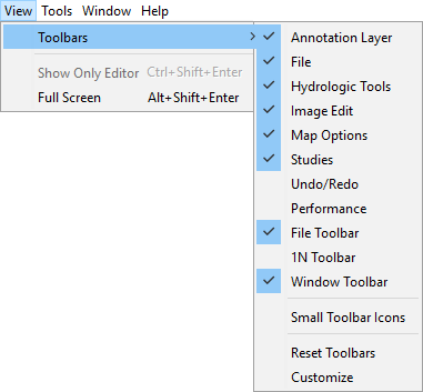 Toolbars | Contains a submenu with all the various toolbars that are available that can be displayed. |