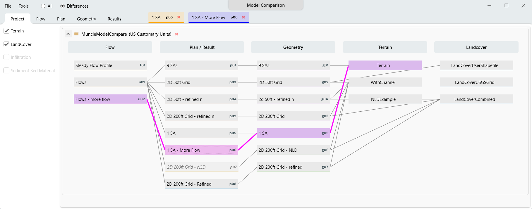To compare plans or geometries double-click on the element to add it to the comparison list. (You can also right-click on the element and choose Add to List.)  As the data are added to the comparison list, the element names will be added to the top of the Model Comparison window, as shown in the figure below.  If data are different the the tabs for Flow, Plan, Geometry, and Results will become active (if the data are not different the tabs will be gray.)