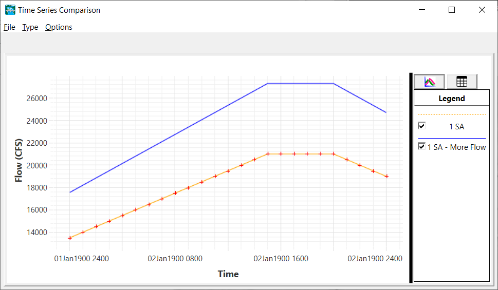 The data will be added with by name and with colors to identify one piece of data from another.  In the example shown above one Plan is Orange, while the other is Blue.  Data visualization will be enhanced by these colors throughout the model comparison tabs (Flow, Plan, Geometry, and Results).  To change the Name or Color, right-click on the data you are comparing and choose Change Alias or Change Color menu item. (You can also access these properties via the Tools | File Aliases and Tools | Color Palettes menu items.)