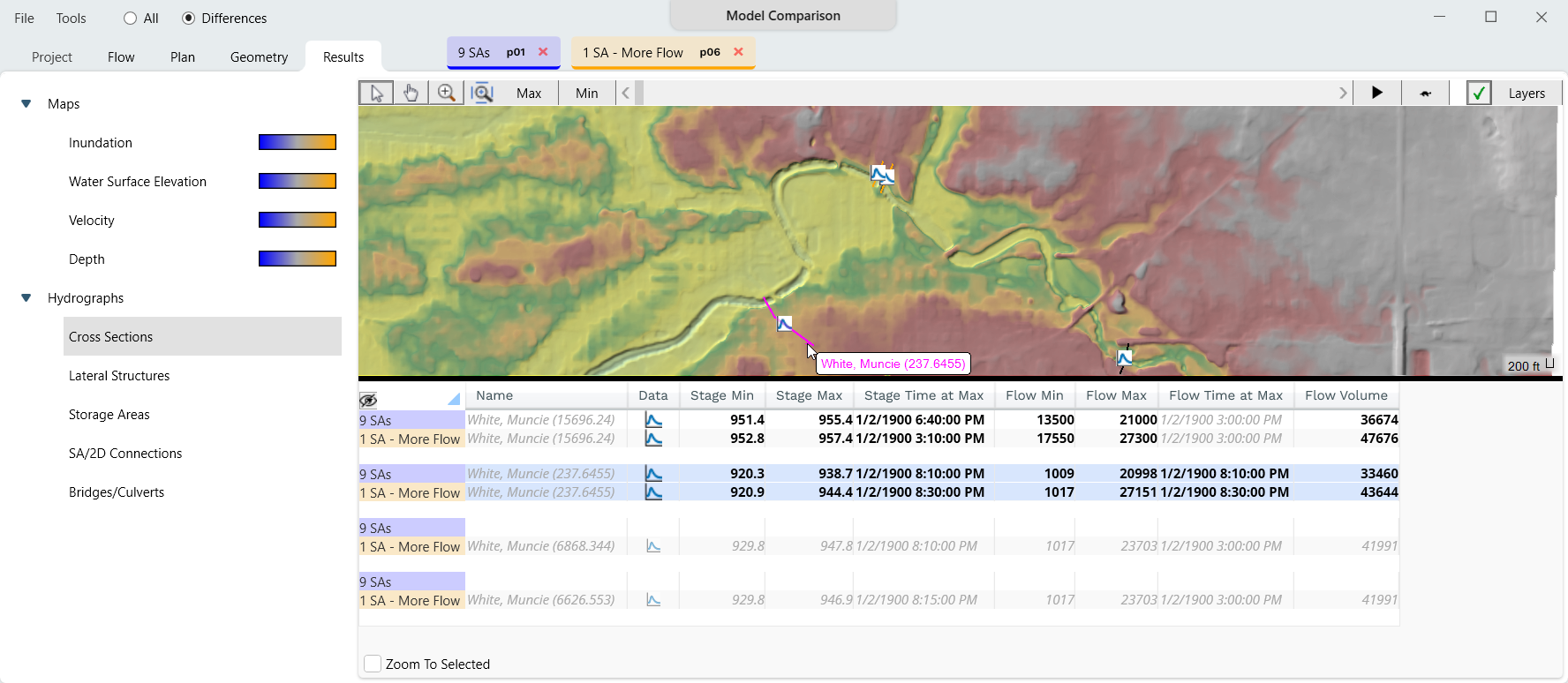 To highlight a location in the in the map, click on a row in the table.  Conversely, when selecting a location in the map, the corresponding row in the table will be highlighted.  For flow data, an the Hydrograph icon will allow you to plot a comparison plot showing the hydrographs and the difference(see below). Differences are computed based on the reverse order listed at the top of the Model Comparison window (second plan minus first plan).