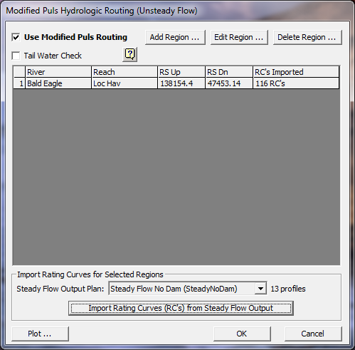 To use the Modified Puls routing option, the user must first create a steady flow plan with the exact same geometry file. The purpose of the steady flow plan is to compute a range of water surface profiles from very low to the highest expected flow rate. The results from the steady flow run are used within the hydrologic routing reaches in order to provide the necessary discharge-volume relationships required by Modified Puls routing. As shown in the figure above, a Steady Flow Output Plan must be selected at the bottom of the editor, which will be used for importing the computed rating curves. Based on the computed rating curves from the steady flow run, and the known distances between cross sections, the program can compute a volume for any flow rate on the fly, in order to solve the Modified Puls equations.
