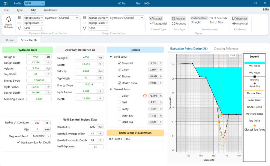 The Hydraulic Design, Riprap and Scour Calculator has two components that track the two main tasks associated with bank-protection design.