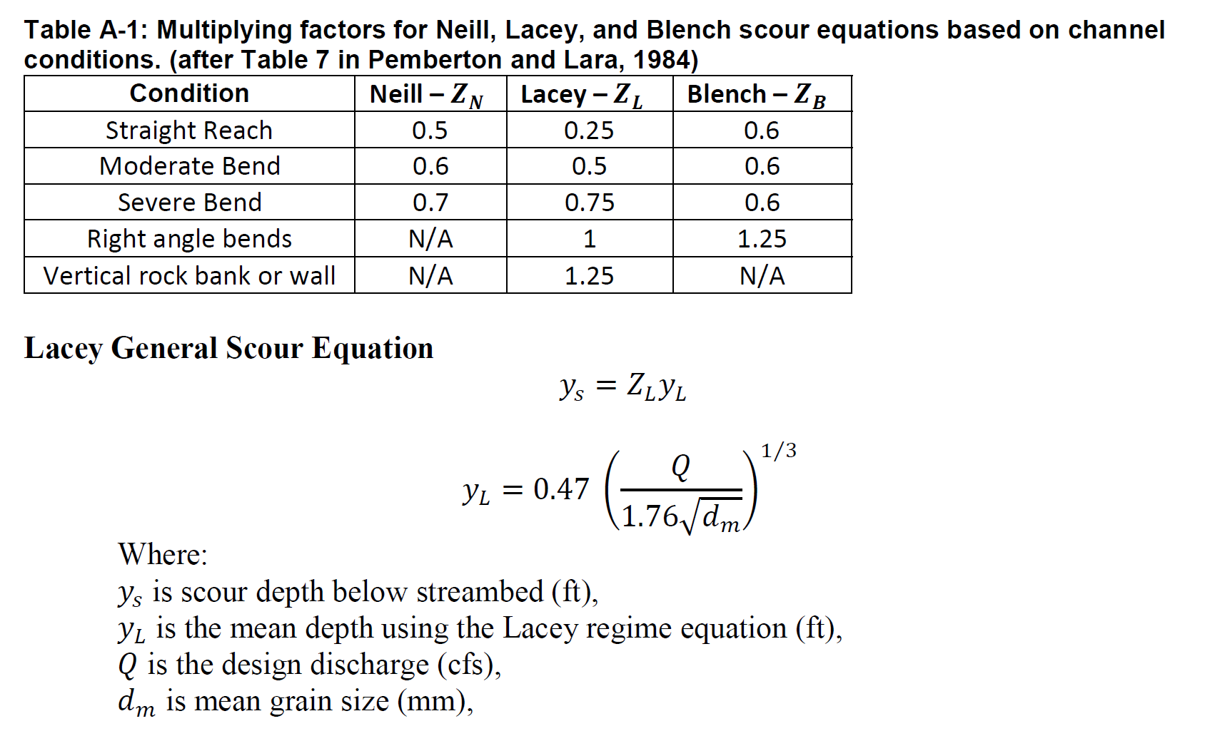 Pemberton and Lara (1984). Computing Degradation and Local Scour, Technical Guideline for Bureau of Reclamation. Denver, CO: Bureau of Reclamation, Engineering and Research Center.