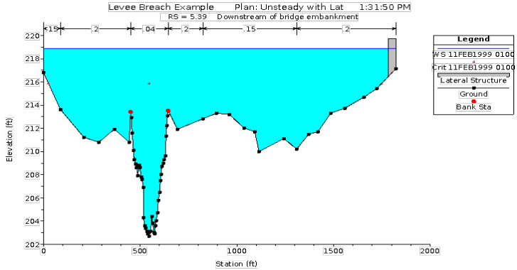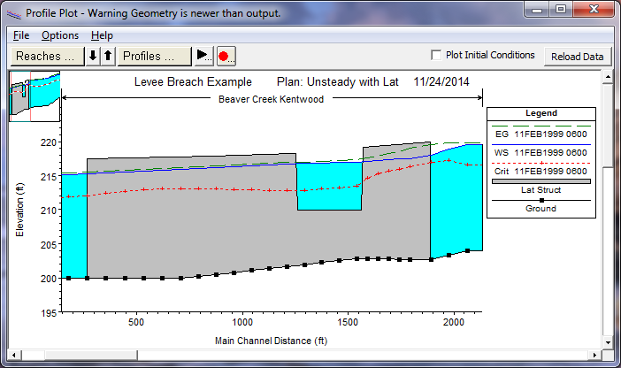 Referring to Figure 14-21 and Figure 14-22, as the levee breaches, the flow going into the storage area and the stage increase quickly, while the stage and flow in the main river drop. In addition to the graphics in HEC-RAS, tabular results are also available. Shown in Figure 14-23 is a detailed output table for the lateral structure. The user can select a specific time line for viewing the output by selecting a specific profile. The profiles are labeled by the date and time they occurred in the model simulation.