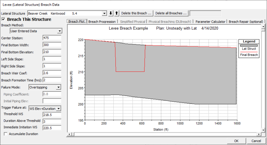Figure 14-19. Levee Breach Editor with Example Levee and Breach.