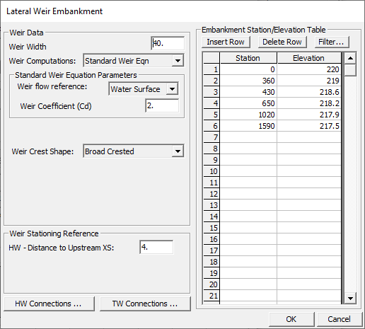 The levee information is entered as station and elevation data in the Lateral Weir/Embankment editor shown on the Lateral Structure editor. The station elevation data represents the top of the levee. The levee information is entered from the upstream end of the levee to the downstream end of the levee. An example of this editor with levee data is shown in Figure 14-18.