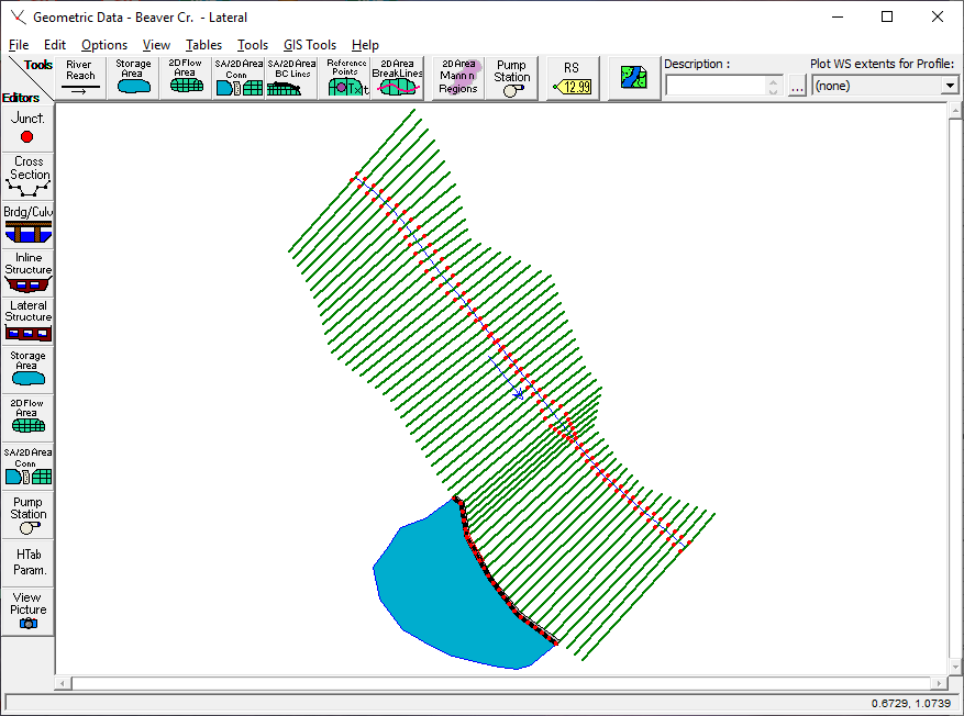 The user defines the levee by entering a series of station and elevation points that represent the top of levee profile. This station and elevation data is then used as a weir profile for calculating the amount of water going over top of the levee. An example levee entered as a lateral structure is shown in Figure 14-17.
