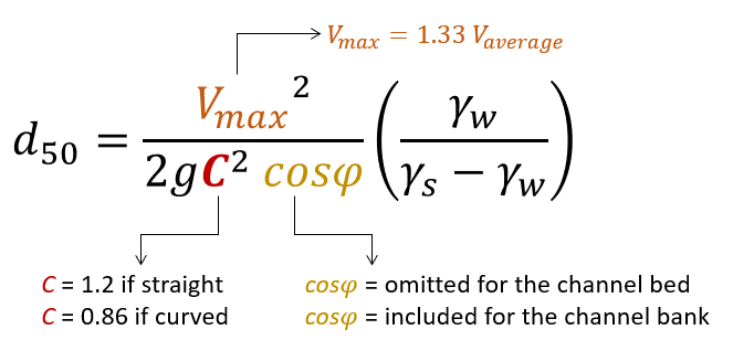 The Maricopa Method modifies the Isbash equation and calculates the d50 (median size) of the riprap for four cases: