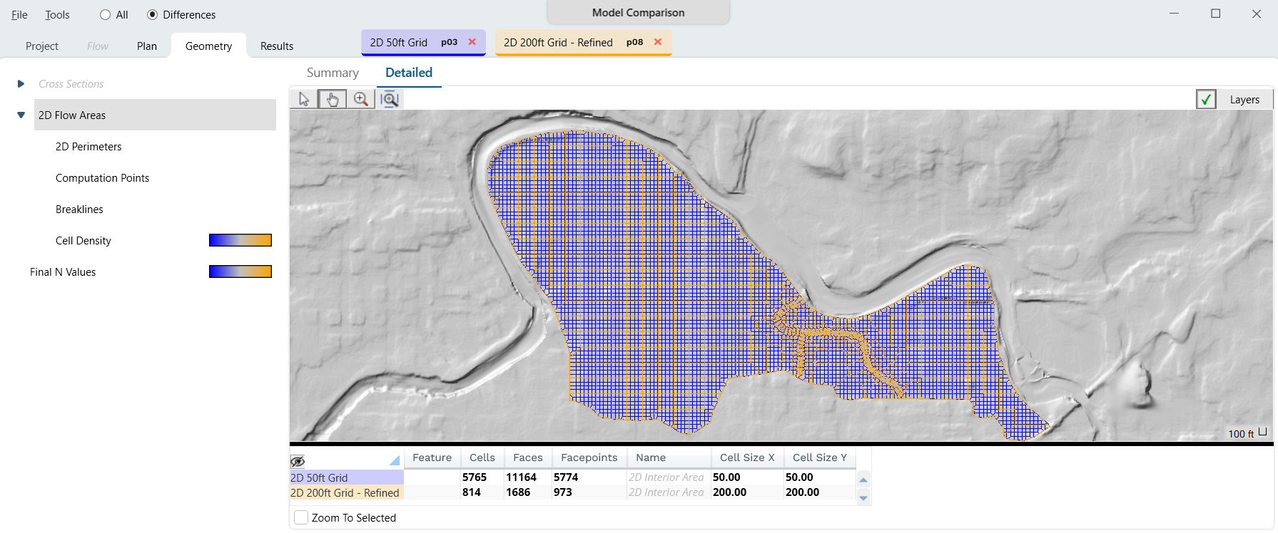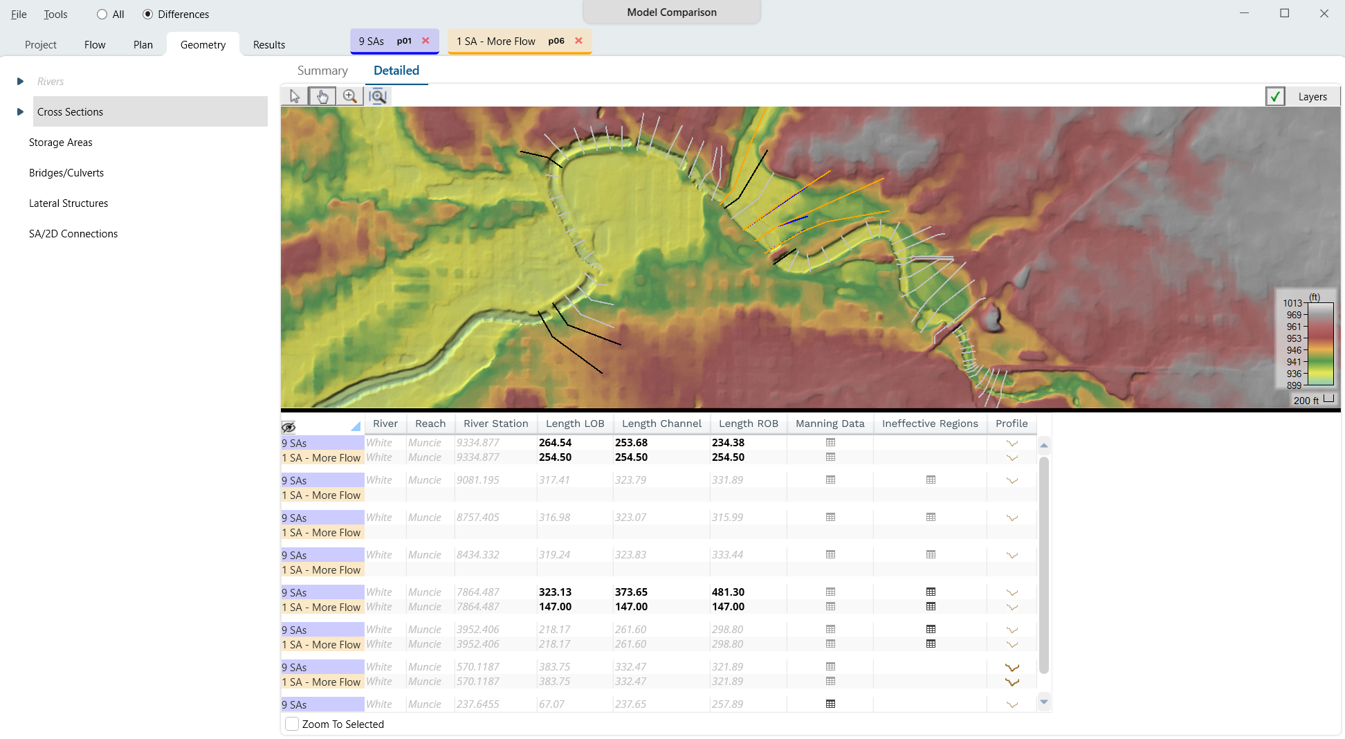 The Model Comparison Tool in HEC-RAS in intended to allow users to evaluate the components of an HEC-RAS project to identify differences in the primary modeling objects. The purpose of the comparison tools is to assist the user to identify subtle differences between HEC-RAS plans. If the model differences are significant and excessive Differences in the project files, geometry, flow, and results can be visualized through tables and spatial plots. The focus of the Model Comparison tools are for unsteady-flow models (comparison capabilities for steady-flow models is not as robust as for unsteady models).