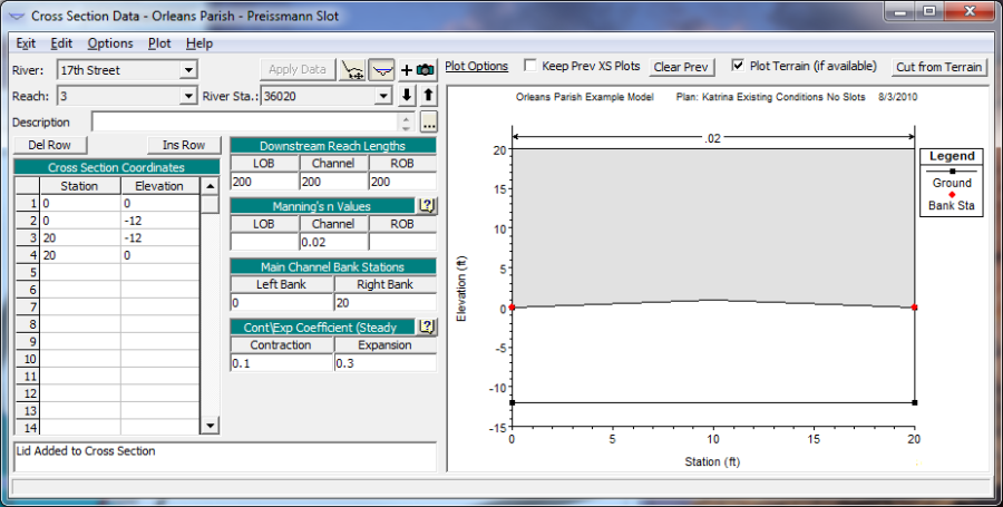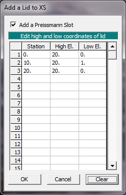 To enter a Lid at a cross section, select Add a Lid to XS from the Options menu on the Cross Section editor. When this option is selected, a window will appear as shown in Figure 14-37.