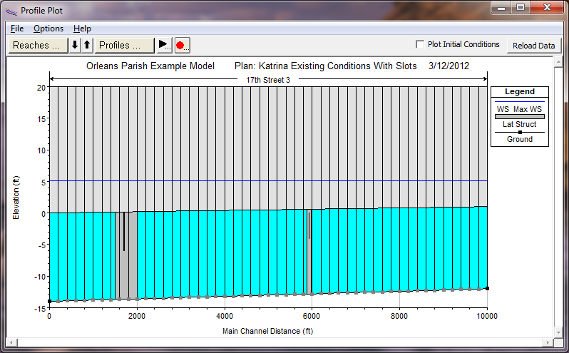 In general, lids can be added to any cross section in the HEC-RAS model. Several cross sections in succession with lids can be used to represent a pipe. Multiple interconnected pipes can be modeled. Lidded cross sections can be used around stream junctions to represent pressurized junctions. However, HEC-RAS does not compute minor losses at junctions, bends, or where pipes change size. This is currently a limitation in modeling pressurized pipe flow with HEC-RAS. Lateral flows can be modeled by either using lateral structures with culverts, or by directly inputting hydrographs as lateral flow boundary conditions. The lateral structure option can be used to mimic drop inlets connecting the surface flow to the pipe. An example of a pressurized pipe with lateral structures connected to the surface is shown in Figure 14-39.