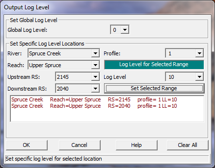 When the user selects Set Log File Output Level, a window will appear as shown in Figure 6-12. The user can set a "Global Log Level," which will be used for all cross sections and every profile. The user can also set log levels at specific locations for specific profiles. In general, it is better to only set the log level at the locations where problems are occurring in the computations. To set the specific location log level, first select the desired reach and river station. Next select the log level and the profile number (the log level can be turned on for all profiles). Once you have everything set, press the Set button and the log level will show up in the window below. Log levels can be set at several locations individually. Once all of the Log Levels are set, press the OK button to close the window.