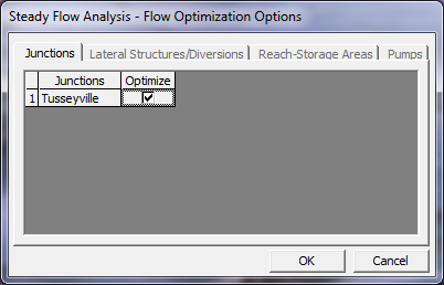Flow Optimizations. This option allows the user to have the program optimize the split of flow at lateral structures, lateral diversions, stream junctions, and pump stations. When this option is selected, a window will appear as shown in the figure below. There are four tabs to choose from. One tab is for each of the following: Junctions; Lateral Weirs/Diversions; Reach-Storage Areas; and Pump Stations.