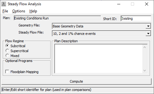 Once all of the geometry and steady flow data have been entered, the user can begin calculating the steady flow water surface profiles. To perform the simulations, go to the HEC-RAS main window and select Steady Flow Analysis from the Run menu. The Steady Flow Analysis window will appear as in Figure 6 9 (except yours may not have a Plan title and short ID).