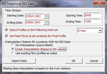 The bottom portion of the window contains options for interpolating flow data at locations that do not have hydrographs in the DSS file. After the flow data are read in, it will be necessary to interpolate flow data at all of the locations listed in the flow data editor that do not have values in the DSS file. Three options are available: no interpolation, linear interpolation, or using the flow data from an existing profile to calculated ratios for interpolating between points that have data. Once all the options are set, the user presses the "Import Data" button, to have the data imported and fill out the flow data editor.
