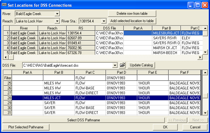 To establish the connection between an HEC-RAS cross section and a particular pathname in the DSS file, the user selects the row in the upper table that contains the river station that they want to connect data to. Next, they select the pathname that they want to connect to that river station from the lower table. Finally, they press the button labeled "Select DSS Pathname," and the pathname is added to the table at the top of the window.
