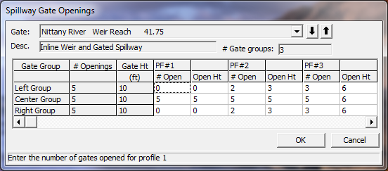 As shown in the figure above, for each profile the user can specify how many gates are opened per gate group, and at what elevation they are opened too. For the example shown in 6, there are three gate groups labeled "Left Group," "Center Group," and "Right Group." Each gate group has five identical gate openings. All of the gate openings have a maximum opening height of ten feet. For profile number 1, only the middle gate group is opened, with all five gates opened to a height of five feet. For the second profile, all three gate groups are opened. The Left gate group has two gates opened to three feet, the Center gate group has five gates opened to five feet, and the Right gate group has two gates opened for three feet. This type of information must be entered for all of the profiles being computed.