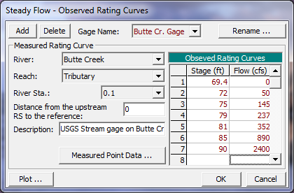 Observed Rating Curves (Gages). This option allows the user to enter an observed rating curve at a gaged location for comparison with computed results. When the user enters an observed rating curve it will show up on the Rating Curve output plot along with the computed water surface versus flow information. To use this option select Observed Rating Curves (Gages) from the Options menu.