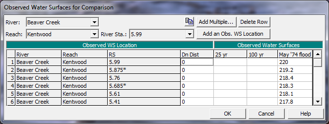As shown in figure above, the user selected a River, Reach, and River Station location, then press the Add an Obs. WS Location (or Add Multiple) to enter a row in the table. Then enter the observed water surface for any of the profiles that are applicable. The column in the table labeled Dn Dist can be used to enter a distance downstream from the currently selected cross section, to further define the actual location of the observed water surface data.