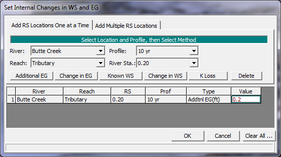 As shown in the figure above, to use the "Set Internal Changes in WS and EG" option, the user first selects the river, reach, river station, and profile that they would like to add an internal change too. Once the user has established a location and profile, the next step is to select one of the five available options by pressing the appropriate button. Once one of the five buttons are pressed, a row will be added to the table at the bottom, and the user can then enter a number in the value column, which represents the magnitude of the internal change or required coefficient.