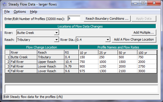 The user is required to enter the following information: the number of profiles to be calculated; the peak flow data (at least one flow for every river reach and every profile); and any required boundary conditions. The user should enter the number of profiles first. The next step is to enter the flow data. Flow data are entered directly into the table. Use the mouse pointer to select the box in which to enter the flow then type in the desired value.