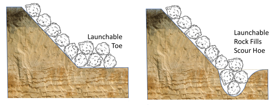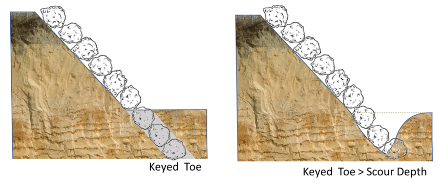 Both these toe protection designs require an estimate of the scour depth. The project team must place a keyed toe deeper than the projected scour depth or compute the correct volume of launchable rock to line the scour hole. In both cases, estimating the scour depth is critical to the design. However, local scour and bend scour are complex processes that are highly sensitive to the local soil properties and the multi-dimensional local flow field. Physical modeling or careful, 3D/CFD modeling paired with extensive soil data collection are the only way to predict local scour depth with any confidence, and even these approaches can have significant uncertainty if they are not calibrated.