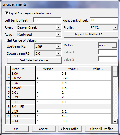 Set Selected Range. Once the encroachment method is selected, and its corresponding data are entered, the user should press the Set Selected Range button. Pressing this button will fill in the table below with the selected range of river stations; the selected method; and the corresponding data for the method. Note that, if the selected method only has one data item, that method's data will go under the Value 1 column of the table. If the selected method has two data items, the first goes into the Value 1 column and the second goes into the Value 2 column. Once the data is put into the table, the user can change the method and corresponding data values directly from the table.