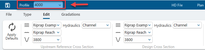 Finally, select the appropriate steady flow profile for the rock size analysis. The Riprap calculator can only compute rock size for one steady flow profile at a time. If your plan has multiple profiles select the appropriate profile in the dropdown box at the top of the calculator.