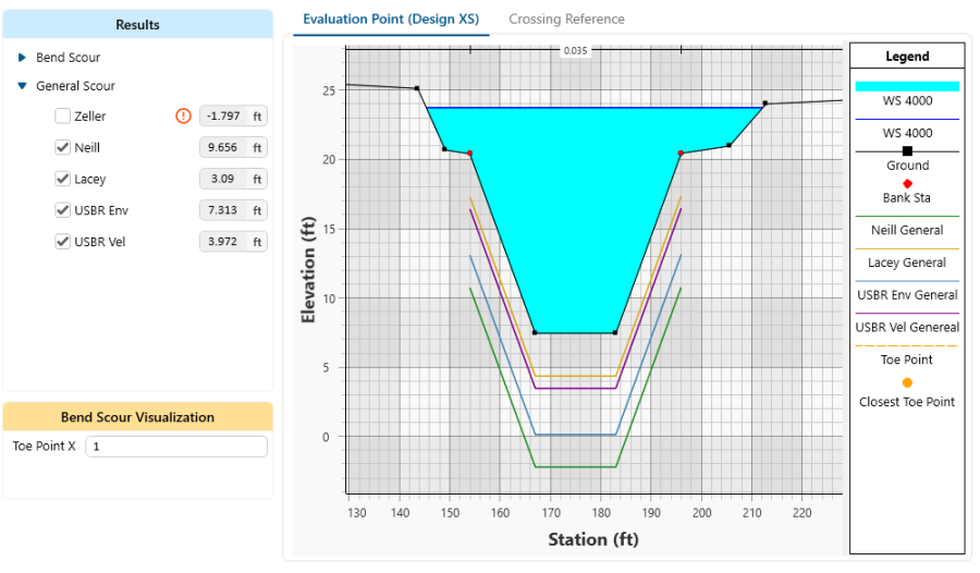 The bend scour visualization is dependent on the number and location of station elevation points. For example, the bend scour visualization above would look very different if the modeler used more station-elevation points to define the cross section.