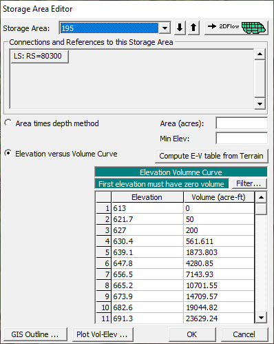 As shown in the figure above, the user has two options for entering information about the volume of the storage area. The first option is a simple area times a depth option. The user enters the area of the storage, and a minimum elevation. The storage area is assumed to have the same area at all elevations, therefore the volume is simply the depth times the area. The second option is to enter and elevation versus volume relationship for the storage area. This option provides more detail and accuracy, and is the recommended method whenever possible. Also shown in the storage area editor are any connections or references to that particular storage area. Valid connections to a storage area are: lateral structures, storage area connections, and a cross section connected directly to a storage area.