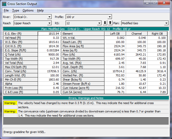 By default, this table comes up displaying detailed output for cross sections. Any cross section can be displayed in the table by selecting the appropriate river, reach and river station from the list boxes at the top of the table. Also, any of the computed profiles can be displayed by selecting the desired profile from the profile list box. Additionally, different plans can be viewed by selecting a plan from the plan list box.