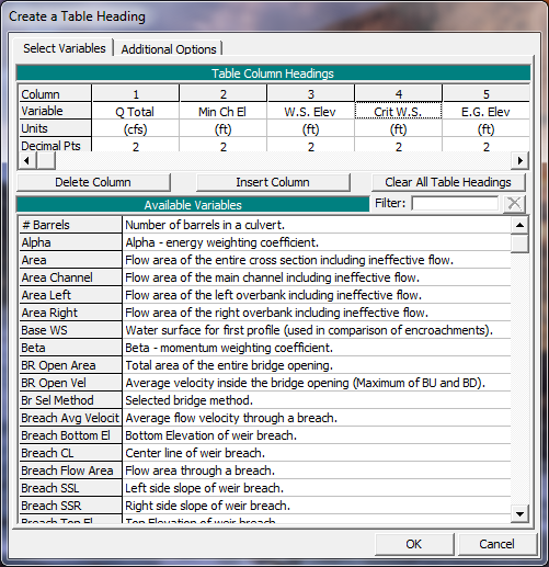 A special feature of the profile summary tables is the ability for users to define their own output tables. User defined output tables are available by selecting Define Table from the Options menu of the profile table. When this option is selected, a window will appear, as shown in the figure below. At the top of the window is a table for the user selected variable headings (Table Column Headings), the units, and the number of decimal places to be displayed for each variable. Below this table is a table containing all of the available variables that can be included in your user-defined table. The variables are listed in alphabetical order. In addition to the variable names, to the right of each variable is a description.