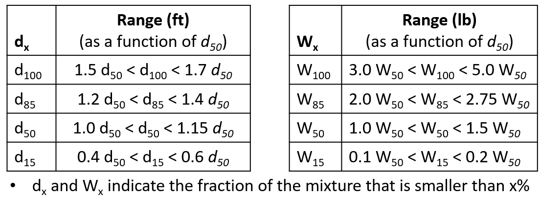 The Maricopa Method computes gradational ranges for the whole riprap mixture based on the d50 (see chart below).  For example, the range of acceptable d85s is a range between 1.2 and 1.4 times the d50.  Weight ranges are computed the same way, with the weight thresholds of 100%, 85%, 50% and 15% finer all all specified as multiples of the median weight (W50).
