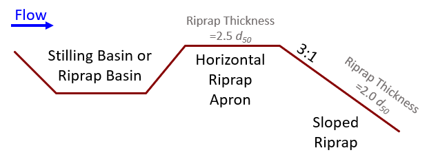 The riprap thickness calculation for this method is more complicated.   It requires a different thickness for the "horizontal" and "sloped" portions of a pre-defined stilling basin design (see figure below).