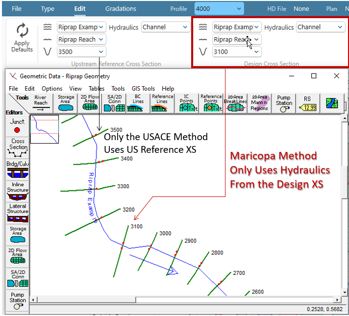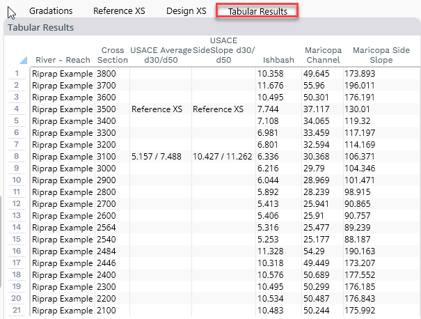Because the Maricopa method uses the design cross section instead of an upstream reference cross section HEC-RAS can apply the method to multiple cross sections at once.  The Riprap tool provides tabular data of the bank (side slope) and bed (channel) d50s for each cross section based on the categorical coefficients specified in the editor and the local, 1D, hydraulics at each cross section. If the user defines a reference and design cross section as well, these tabular data will also include a single USACE d30 (at the design location, but using the reference cross section hydraulics).