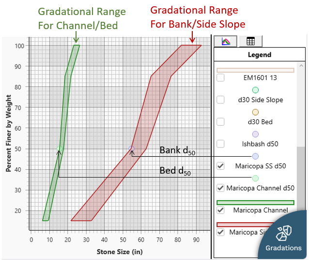See the documentation on adding customized gradations to learn how to add available rock gradations to the riprap tool and evaluate them based on the gradation ranges plotted.  (Note: If the Maricopa method is selected curves and polygons associated with the USACE method are deemphasized in the plot but still available for comparison.  Unclick these polygons and points in the legend - as depicted in the figure above - to only plot Maricopa Results).
