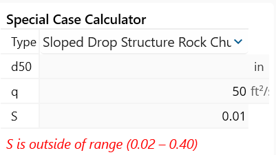 This method only works for slopes between 0.02 and 0.4.  If you select a slope outside that range it will not compute a d50 and will return an error message: